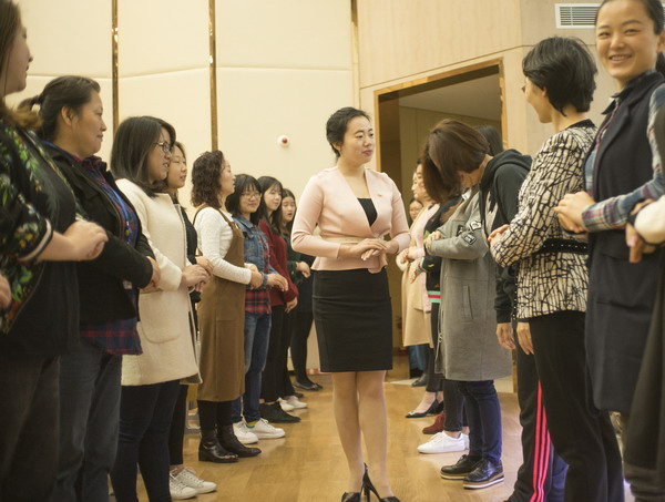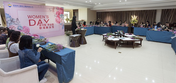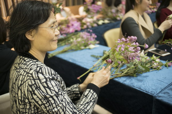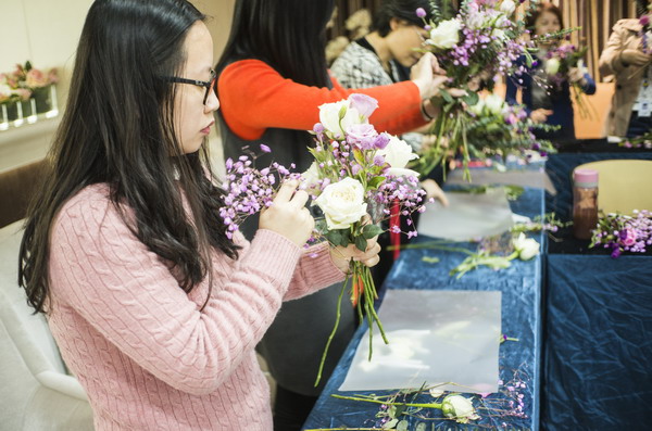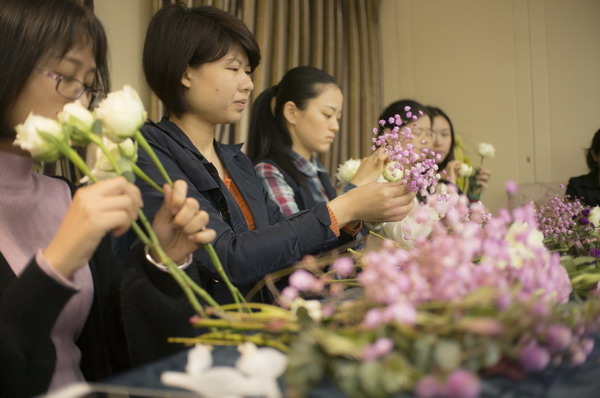在插花培训环节,插花艺术培训师首先简要介绍了鲜花选取的诀窍要领。随后讲学结合,在讲解插花要领和技艺的同时,邀请全集团女员工一同实践插花技巧,体验插花艺术。经过巧妙的创意组合,白玫瑰、桔梗、满天星等鲜花错落有致的变成了一组组赏心悦目的艺术品。