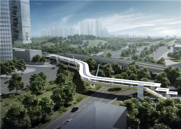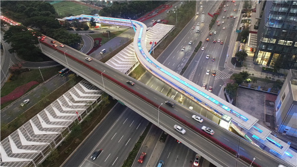 天桥全长235. 56米,包括主桥和南北两段梯道。主桥为索辅梁桥,全长180. 8米,共5跨,最大单跨为53米,主桥平面线型为反“S”型。