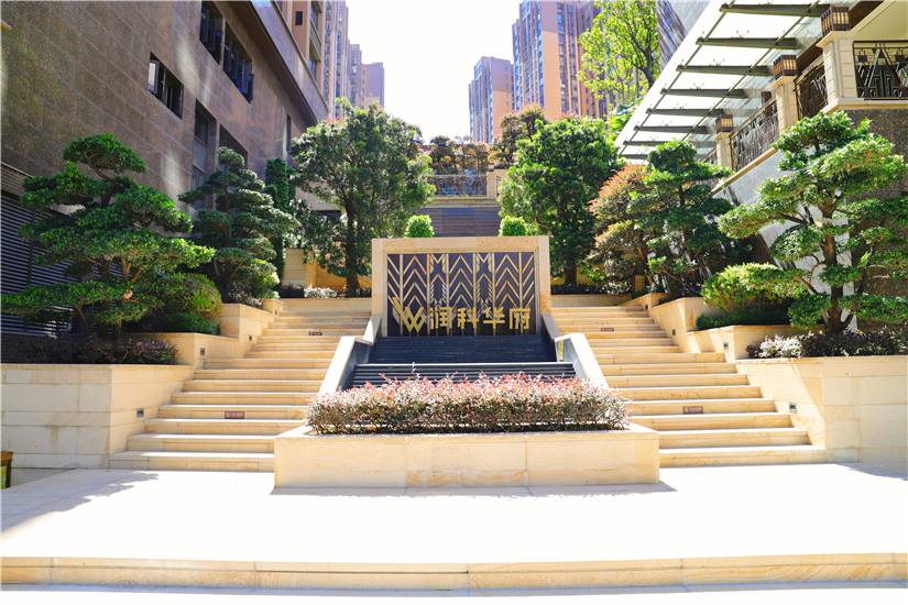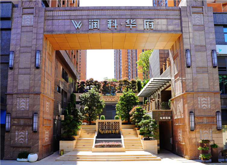 润科华府八层以下及裙楼外立面干挂石材幕墙面积13800平方米,玻璃幕墙5500平方米。